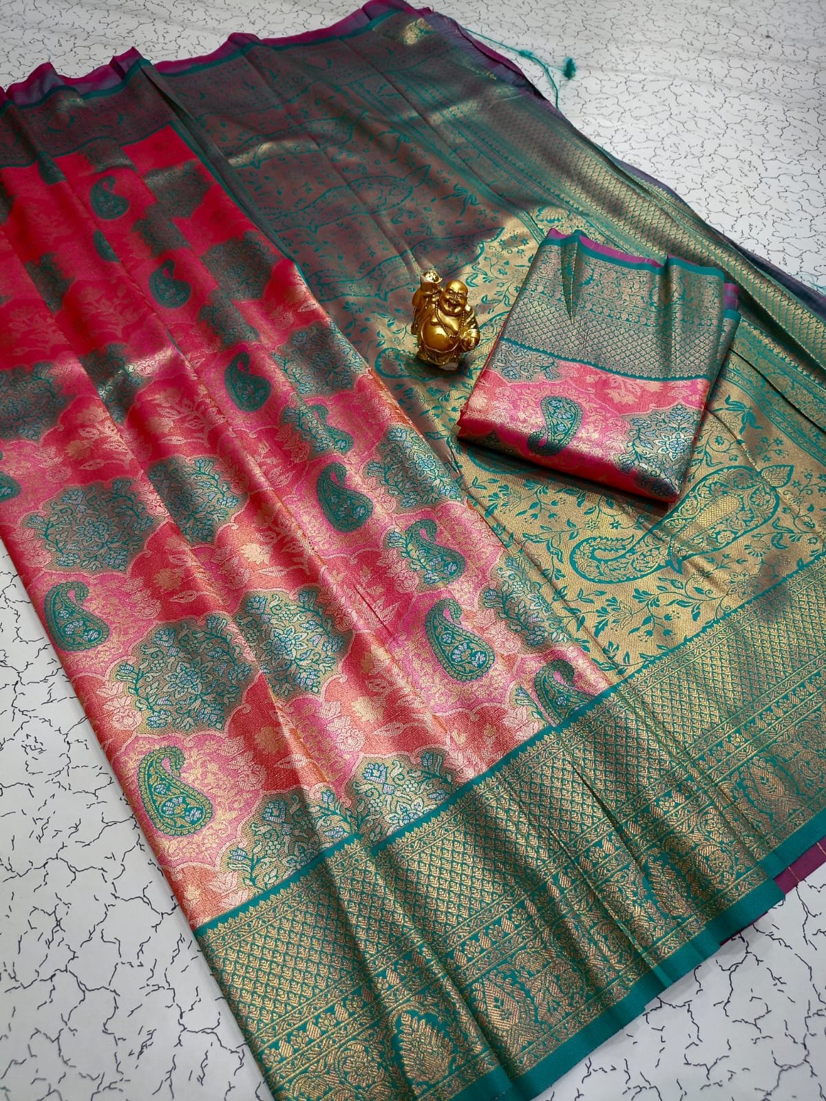 Striking rani pink body with elegant teal woven undertones