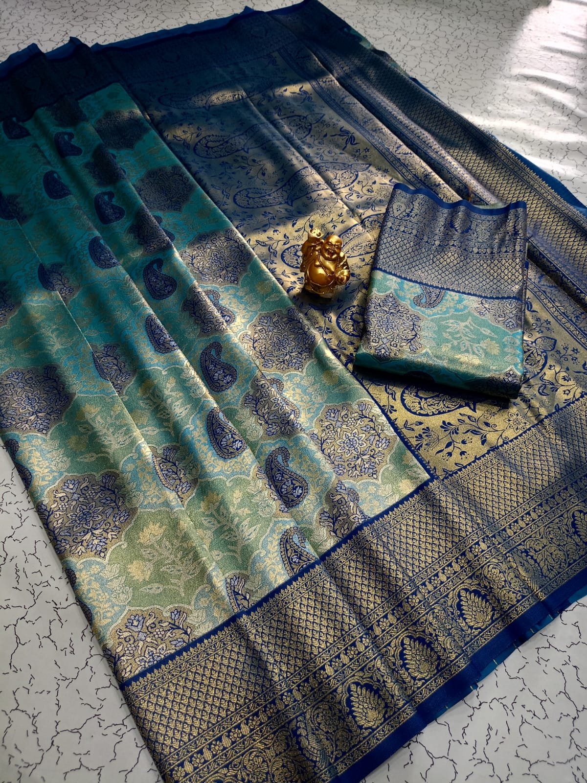 Sophisticated teal-blue body with intricate paisley and floral zari motifs