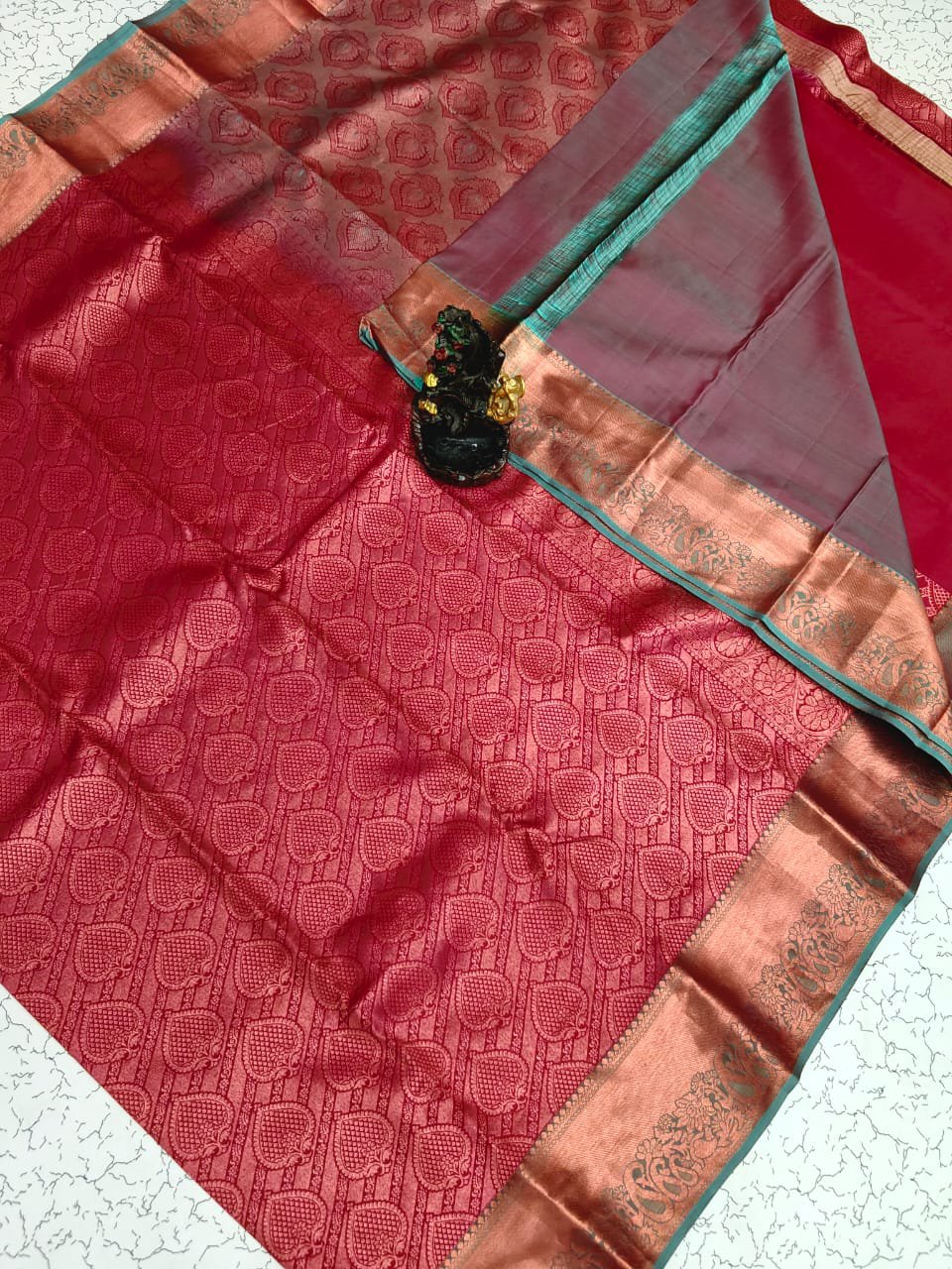 🎨 Colour: Rich traditional red body with elegant copper zari border and contrasting teal pallu