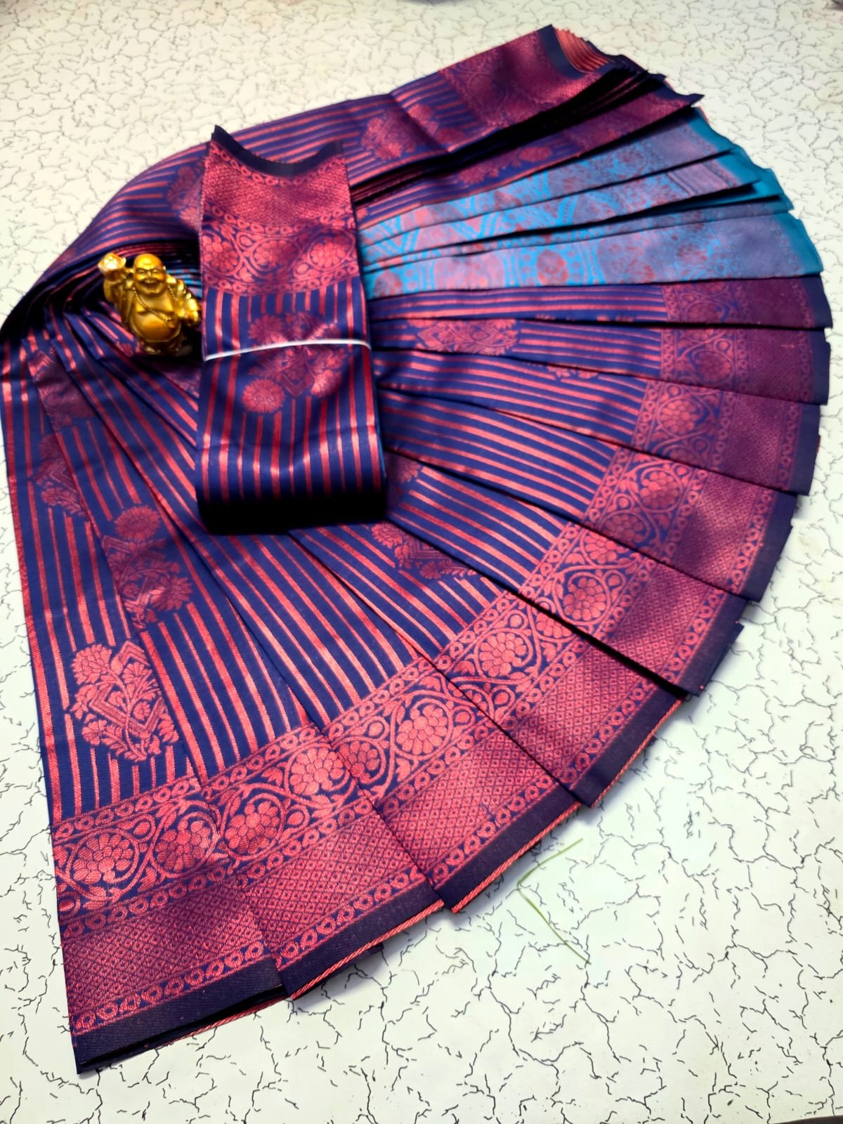 Elegant navy blue body with rich magenta zari stripes
