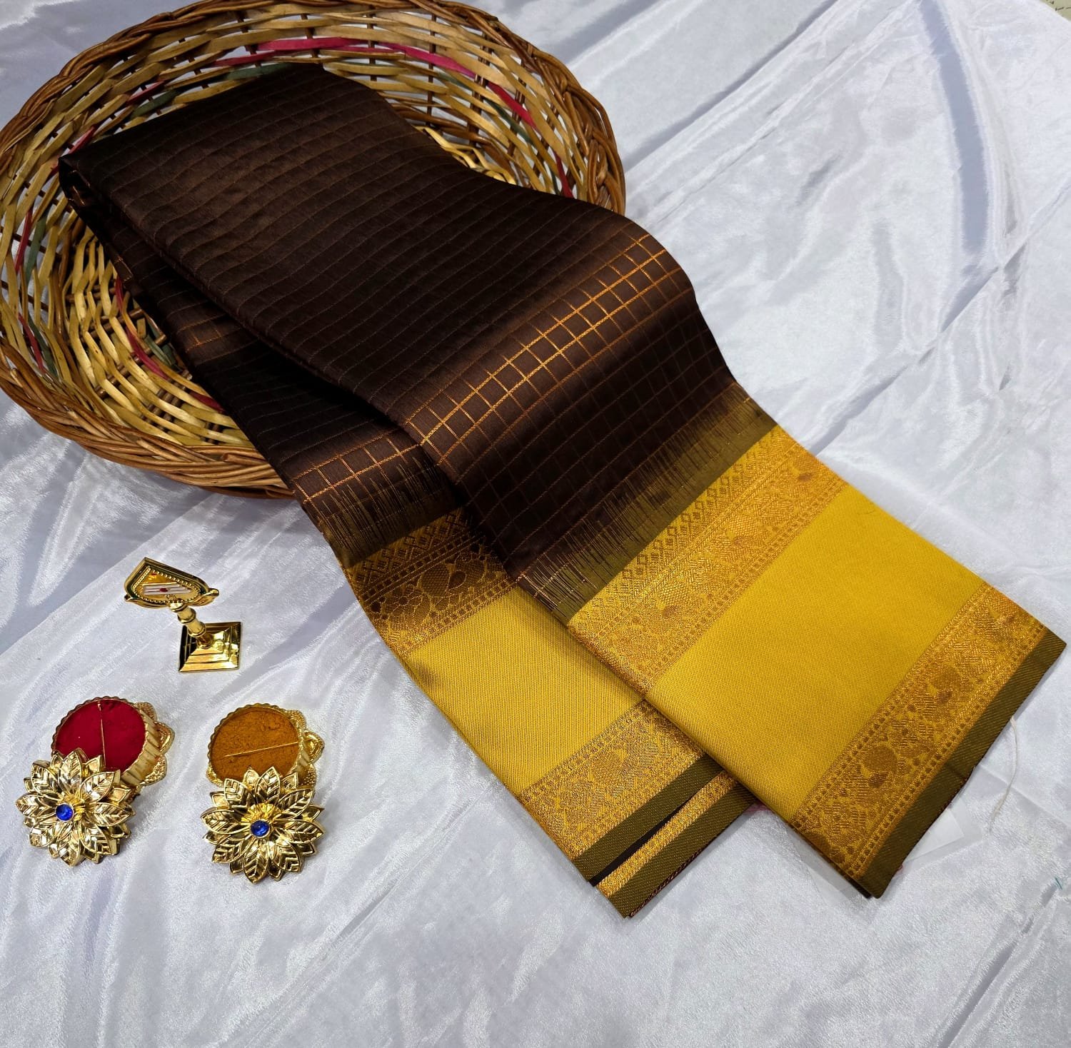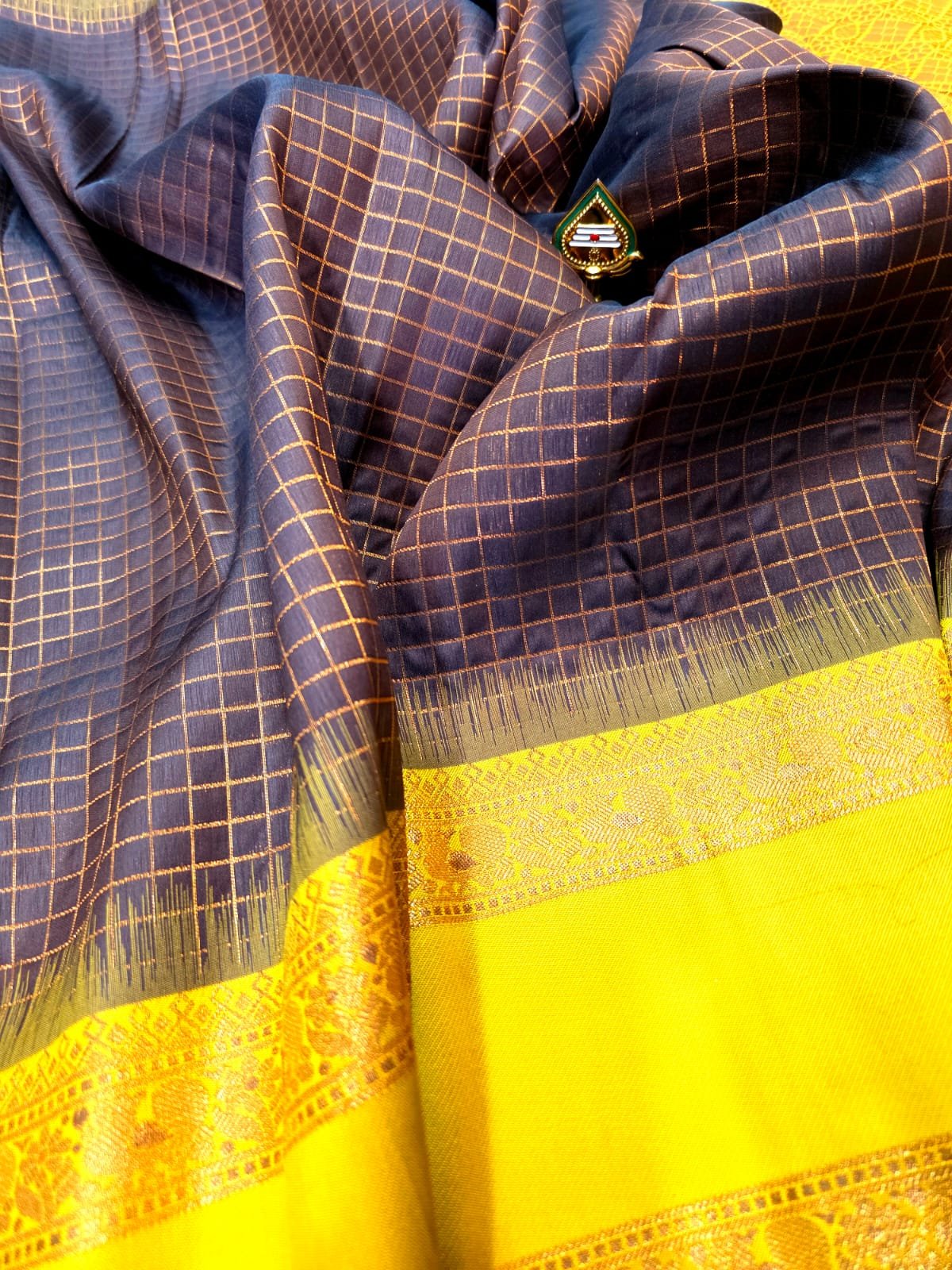 Rich mustard-gold pallu with intricate all-over zari weaving