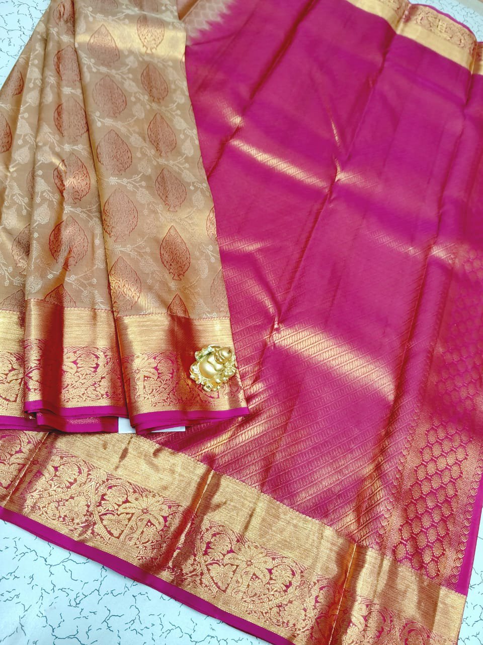 Pallu: Contrast golden-beige pallu adorned with classic zari paisley (mango) motifs