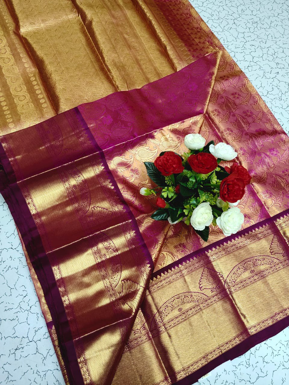 Rich woven floral and traditional motifs enhancing the royal charm