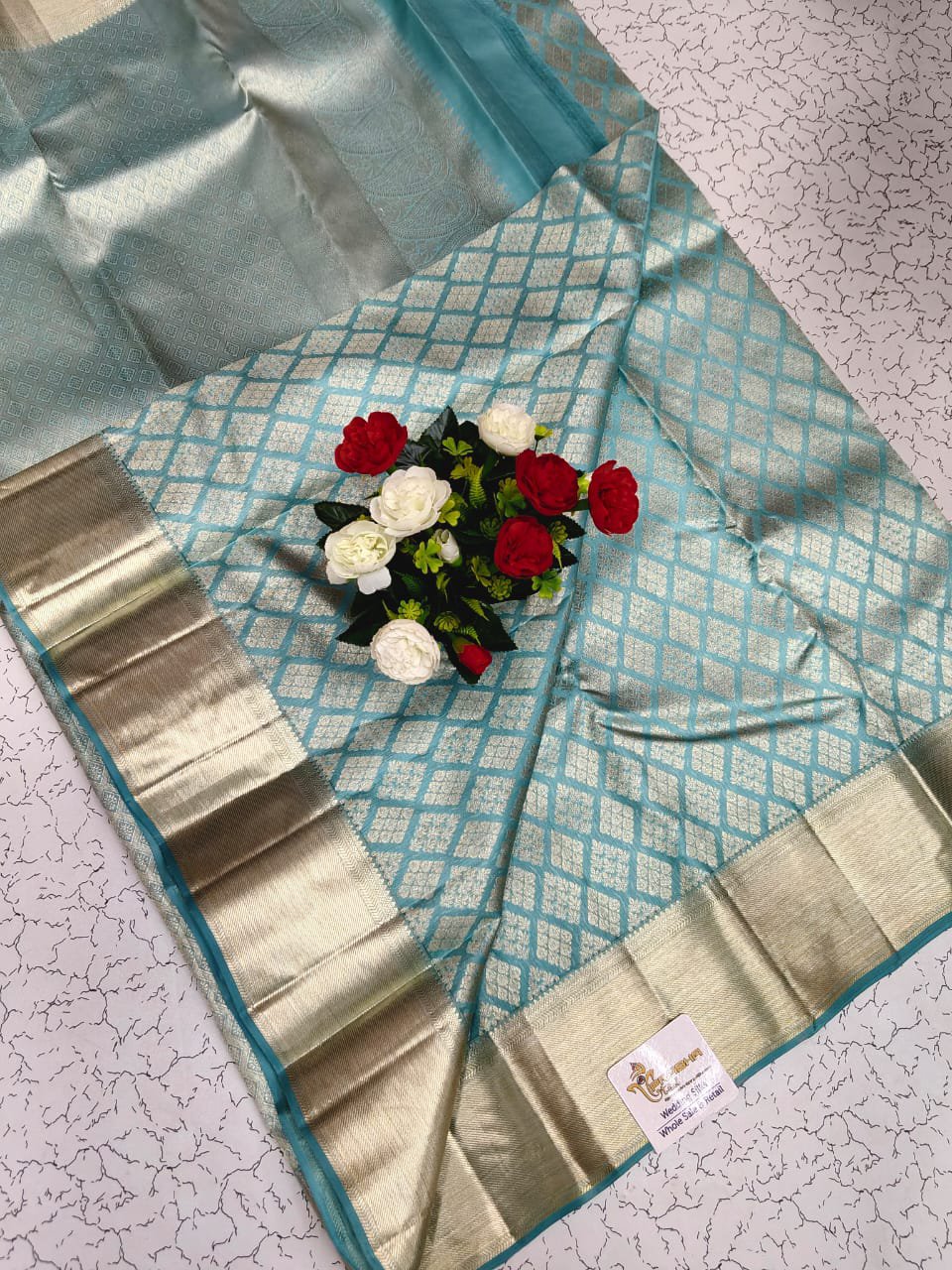 Elegant teal blue base with silver zari geometric and floral motifs